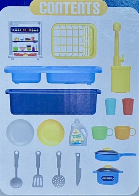 הערכה כוללת : כיור, רשת לכלים, כיריים גז, כוסות, ברז, מחבת, סיר, בקבוק דמוי סבון, צלחות וסכו"ם.